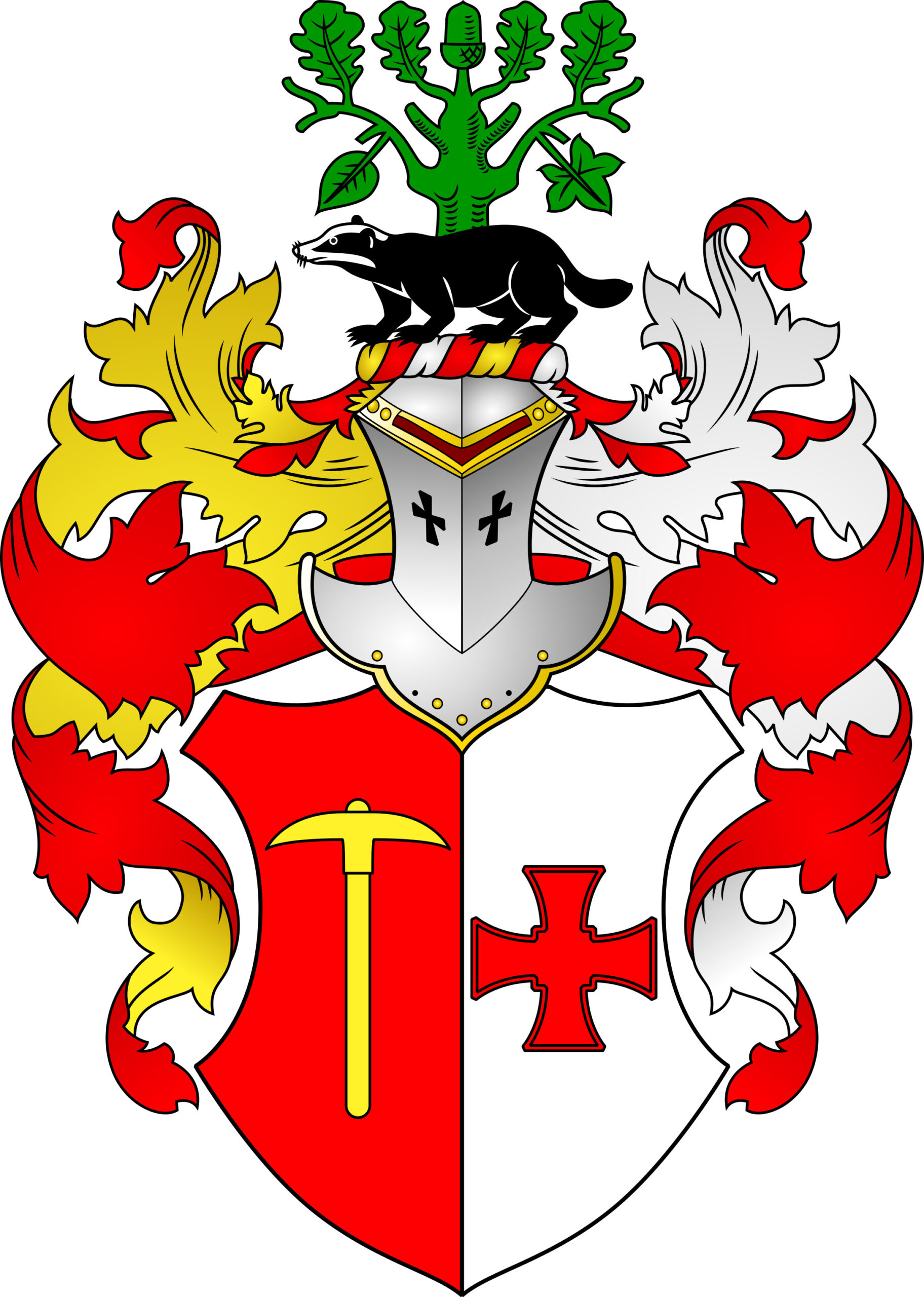 Tarcza dzielona w słup, czerwono- srebrna. W 1, złoty kilof w słup, styliskiem w dół. W 2, czerwony krzyż walecznych. Klejnot: na czerwono – złoto – srebrnej nałęczce, zielone drzewo dębu, o jednym żołędziu na samej górze, w towarzystwie dębowych liści, po dwa z każdej strony, wszystkie w słup. U dołu dwa zwisające liście, prawy wiązu, lewy jaworu. Przed drzewem stojący borsuk. Labry: prawe czerwone podbite złotem, lewe czerwone podbite srebrem.