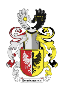 Na tarczy czerwono-złotej dzielonej w słup, na linij cięcia orzeł w barwach srebrno-czarnych.Klejnot: dwa skrzydła orle, prawe srebrne obłożone złotym kołem, lewe, czarne obłozone złotą wagą. Labry: prawe czarne podbite srebrem, lewe czarne podbite złotem. U dołu na wtędze, maksyma łacińska,, Pecunia non olet”