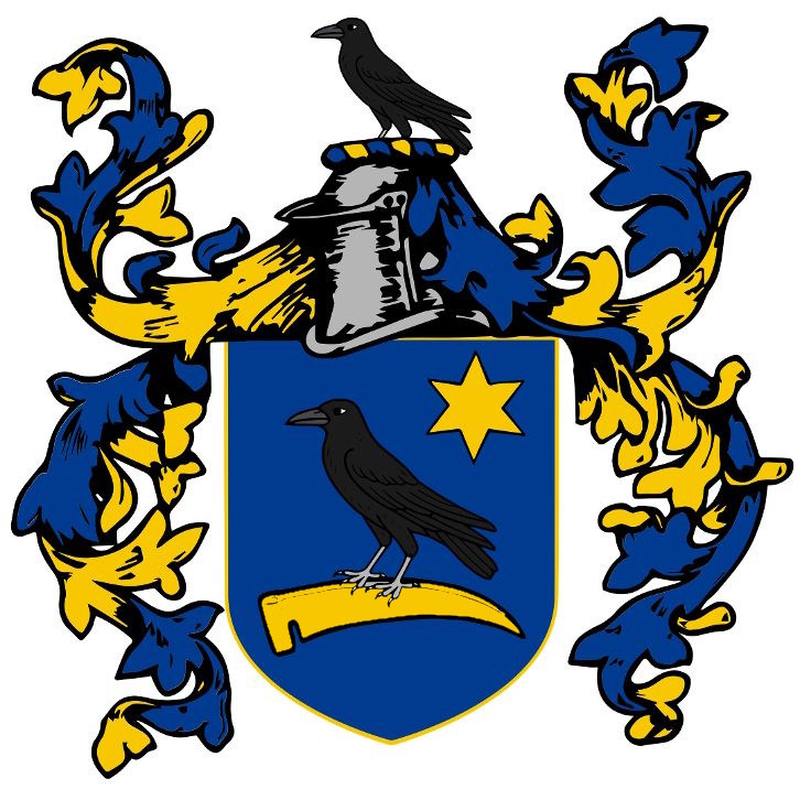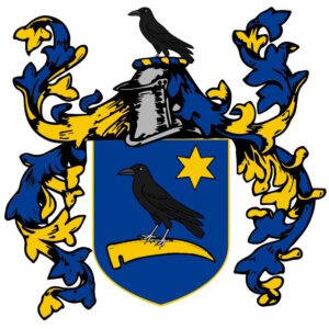 Na niebieskiej tarczy czarny kruk, siedzący na na złotym ostrzu kosy skierowanym w lewo. Ponad nim, z lewa, w obszarze głowicy, złota piecioramienna gwiazda. Klejnot: na nałęczce w barwach niebiesko-złotych, takiż kruk jak w godle. Labry: niebieskie podbite złotem.