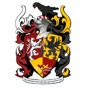 Tarcza dzielona w słup barwy czerwono-złotej, na której złożono, na przeciw siebie stojących, srebrnego lwa i czarnego gryfa trzymających dolnymi łapami złotą koronę szlachecką, pod która na linii cięcia, trzy niebieskie kwiaty lnu, jeden nad drugim.U dołu na podwyższonej trójgórze dzielonej w barwach przemiennych tarczy, dwie srebrne wstęgi w pas, jedna nad drugą, obłożone dwoma skrzyzowanymi kopiami, ponad którymi abdank złożony, oba w barwach przemiennych trójgórza. Klejnot: czarny kruk trzymaj w dziobie złoty pierścień. Labry: prawe czerwone podbite srebrem. lewe czarne podbite złotem. Na wstedze maksyma,, Qui ambuland erecti inter illos qui in genibus sunt”