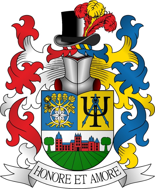 Tarcza dzielona w pas, góra w słup, w barwach niebiesko – złoto – srebrnych. W 1, złote ukorzenione drzewo liściaste z owocami trzech drzew: kasztana, dębu, orzecha, obłożone srebrną różą wiatru. W 2, litera PSI barwy czarnej, z którą przepleciony, rozstawiony w słup, cyrkiel kreślarski, niebieski. W 3, na podwyższonej zielonej podstawie, czerwona wielowieżowa budowla pałacu, w towarzystwie dwóch zielonych symbolicznych drzew. Klejnot: na nałęczce w barwach przemiennych srebrno – czerwono – złoto – niebieskich, cylinder czarny, upiększony trzema strusimi piórami, barwy czerwono – niebiesko – złotej. Labry: prawe, czerwone podbite srebrem, lewe niebieskie podbite złotem. U dołu łacińska maksyma ,,Honore Et Amore”