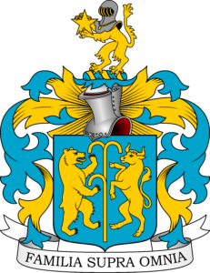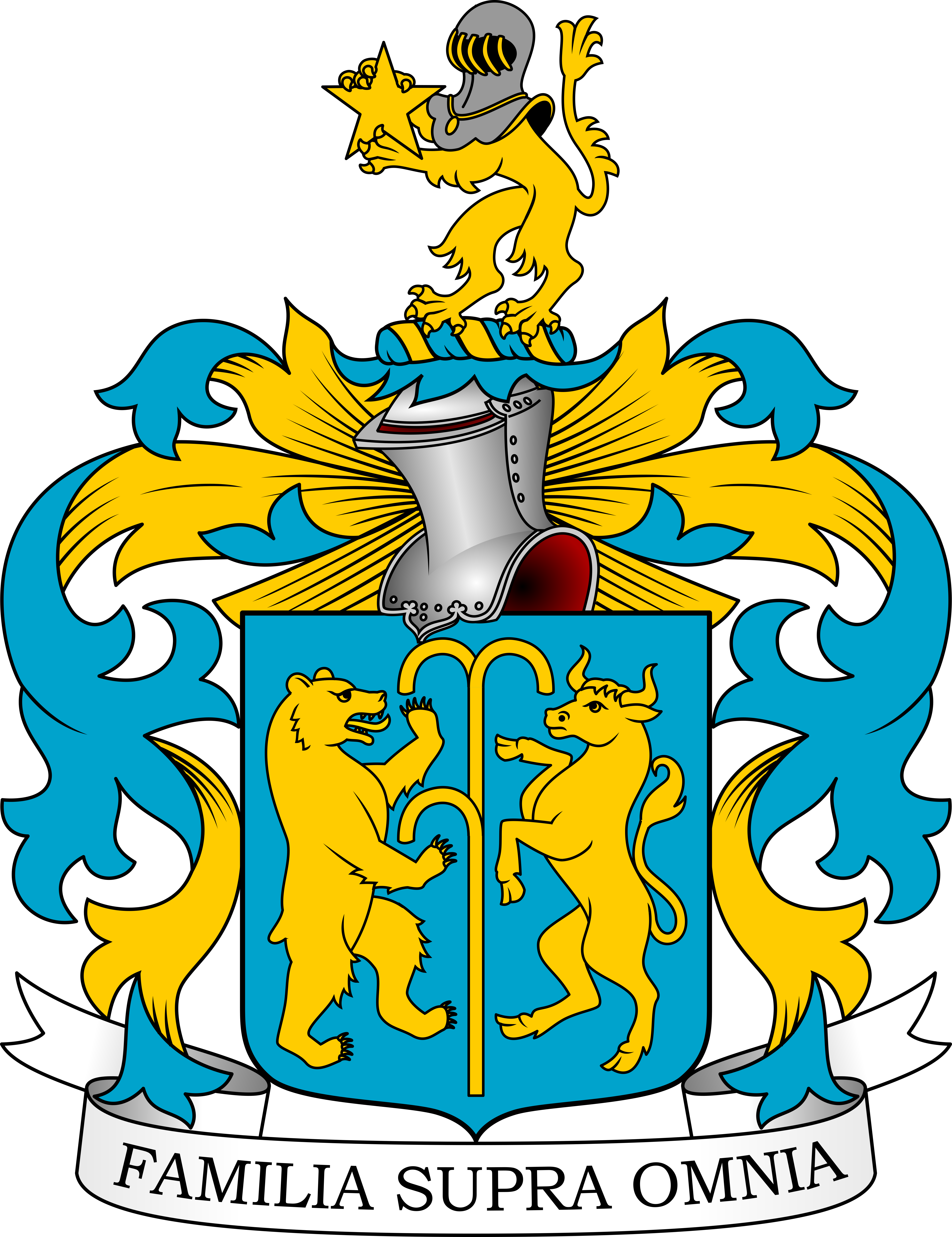In blau, ein nach links gewendeter, aufrechter Bär, und ein aufrechter Stier. Dazwischen ein Wanderstab mit drei gebogene Hacken. An der spitze links und rechts, in der Mitte, auf der rechte Seite. Alles im Gold. Auf dem blau-golden bewulsteten Helm mit blau-goldenen Decken ein wachsender goldener Löwen, in den Pranken ein fünfstrahligen goldenen Stern haltend. Unten, Devise ,,Familia Supra Omnia”