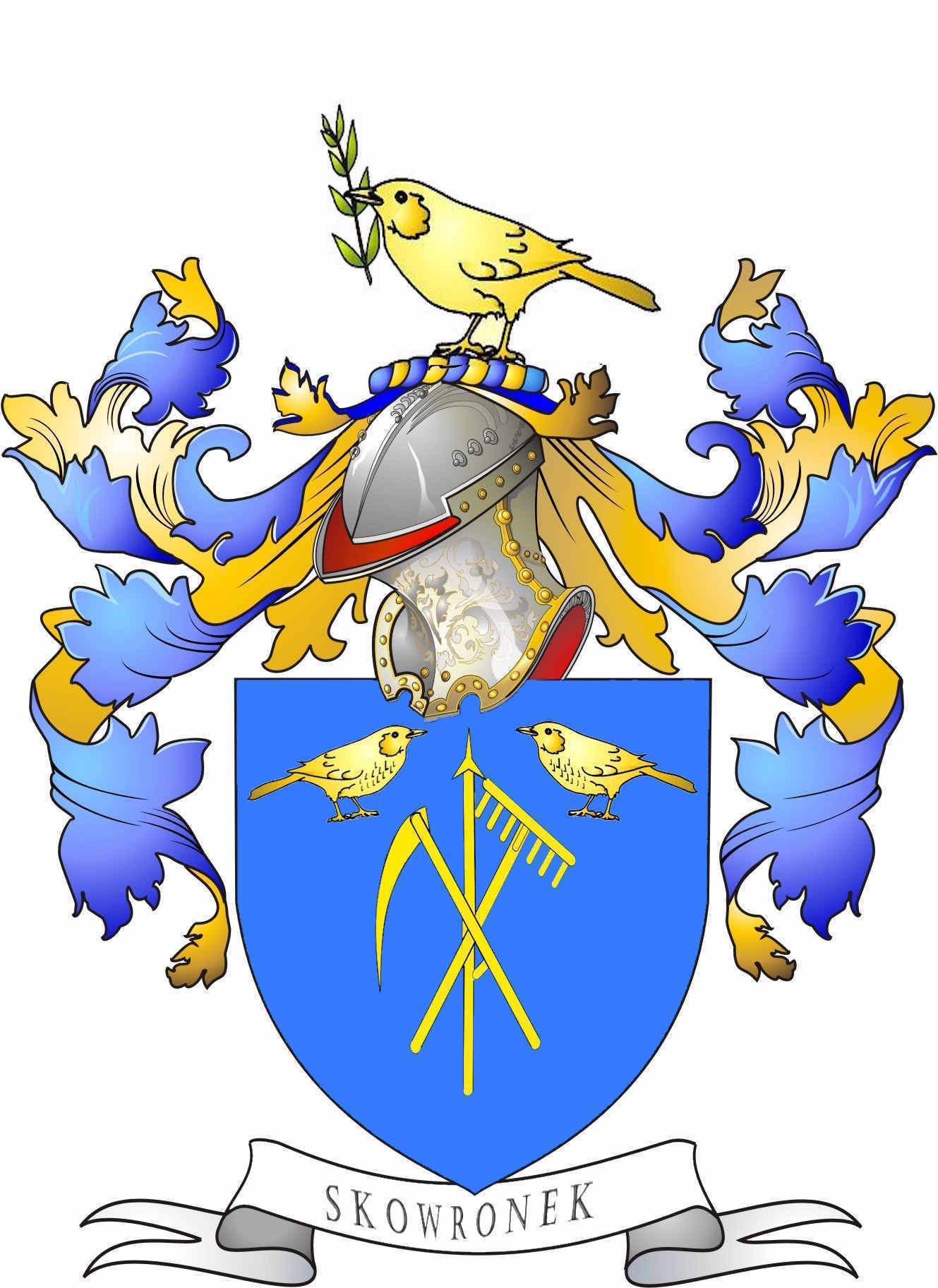 Na niebieskiej tarczy, skrzyżowane grabie i kosa, złożone na sotojącej w słup włóczni, w towarzystwie dwóch skowronków zwróconych do siebie, złożonych powyżej w obszarze głowicy. Wszystko w złocie. Klejnot:na nałeczce w barwach niebiesko-złotych skowronek z gałązka oliwną w dziobie. Labry:niebieskie podbite złotem.